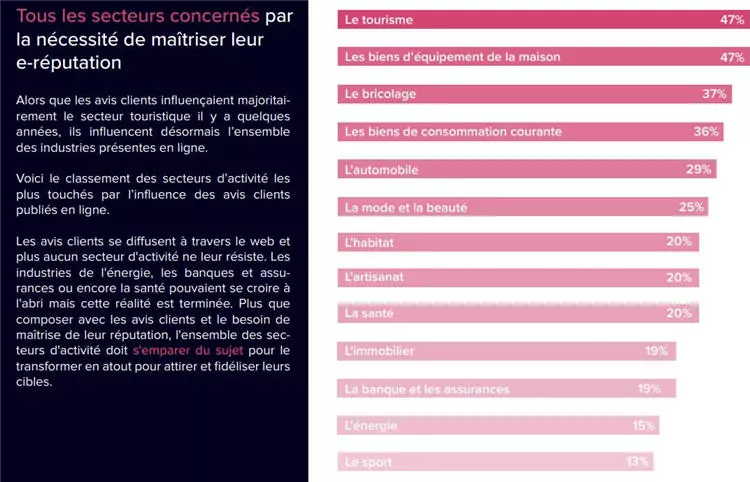Tous les secteurs sont concernés par l’influence des avis. On pense évidemment au tourisme, pour lequel une décision d’achat sur deux est influencée par un avis, mais l’énergie les secteurs de la banque et de l’assurance ne sont pas épargnés, avec 15 à 20% de décisions guidées par la réputation.