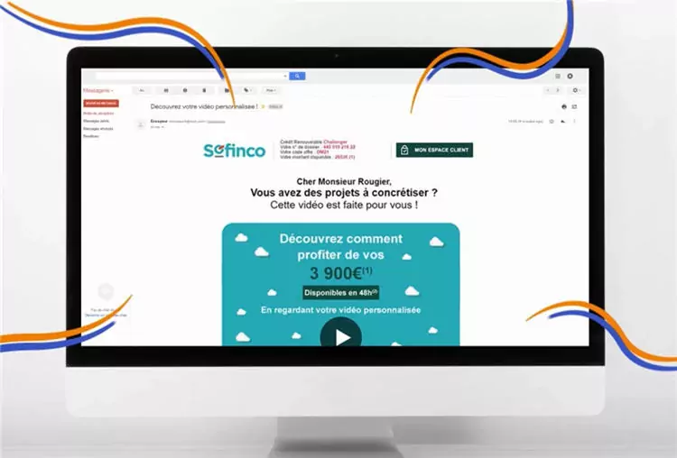 Les vidéos personnalisées peuvent être des animations générées automatiquement dans lesquelles on insère des informations personnelles, comme le nom du client, le solde de son compte ou la date de renouvellement de son contrat. Cette vidéo réalisée par Vidata pour Sofinco en est un bon exemple: