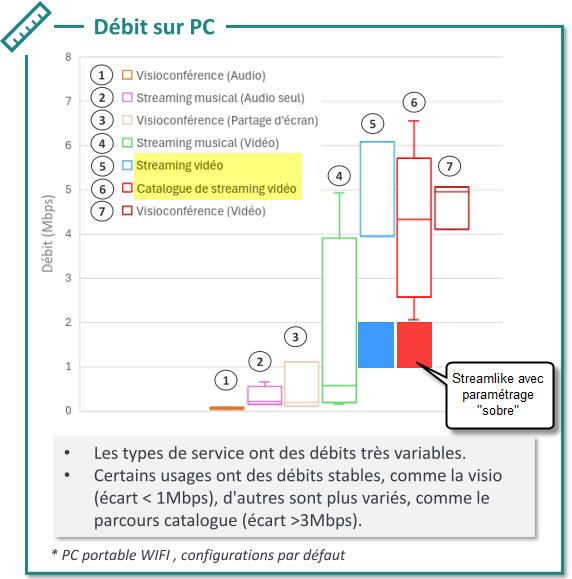 Les réglages de sobriété par défaut que propose Streamlike permettent d’atteindre des débits moyens très inférieurs à la moyenne des services de streaming mesurés.